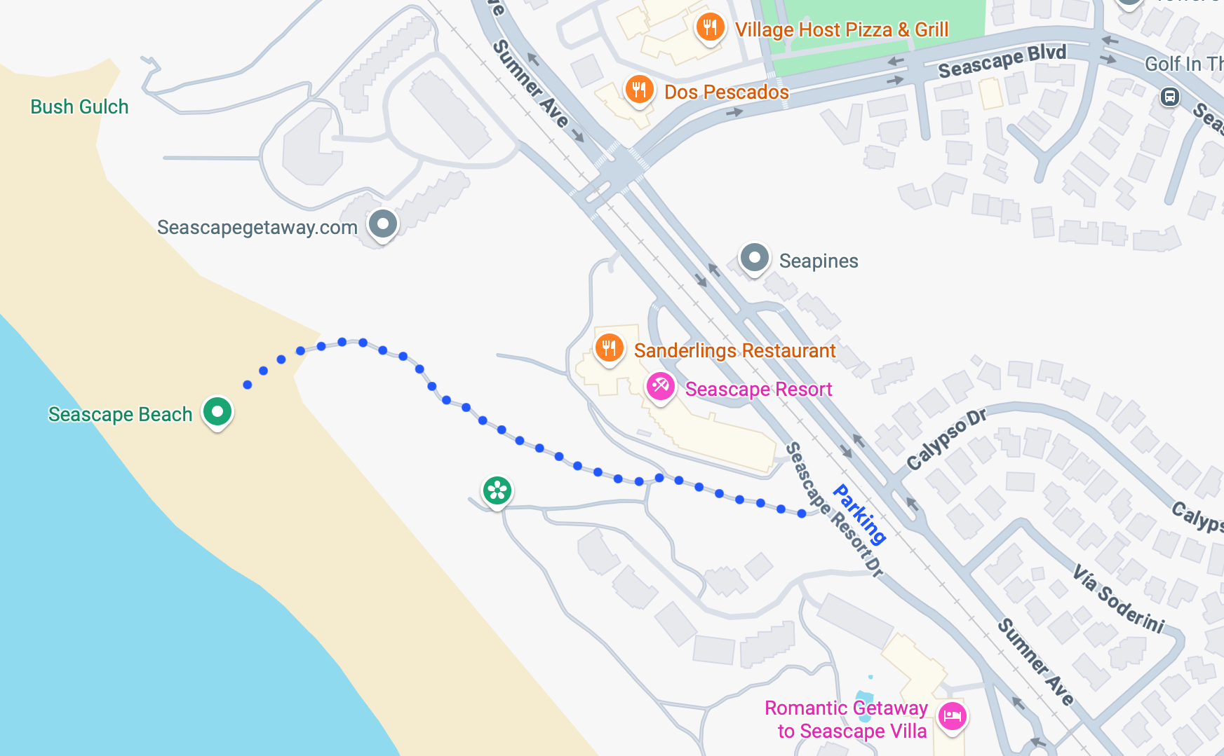 The red pin shows precisely where the trailhead intersects with Seascape Resort Drive. Park here and then follow the trail to the beach (below).
